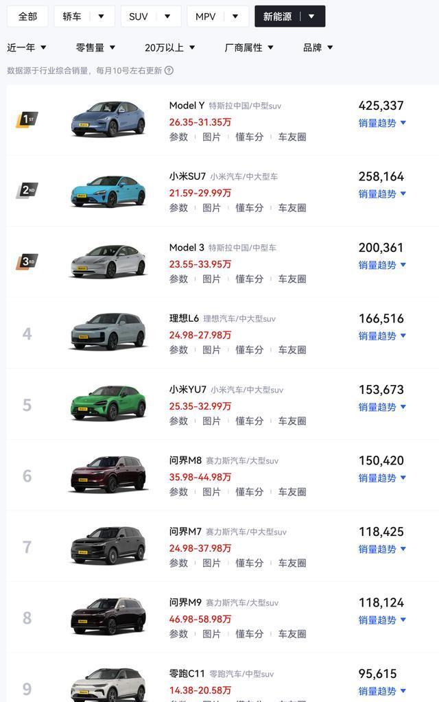 第一,特斯拉Model Y,这是去年的销量王者,卖出了超过42.5万辆,远超竞争对手;无论是价格差不多的理想L6、小米YU7、问界M7、智界R7,还是销量更高的问界M8、问界M9,在销量上都不是特斯拉Model Y的对手。