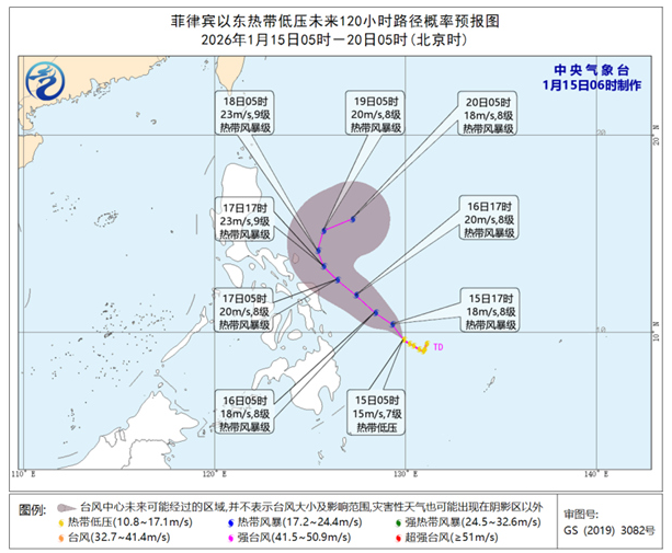 据中央气象台消息大牛网,菲律宾以东洋面热带低压的中心今天(1月15日)5时位于菲律宾马尼拉东偏南方向约1120公里,就是北纬9.6度、东经129.9度,中心附近最大风力有7级(15米/秒),中心最低气压为1002百帕。